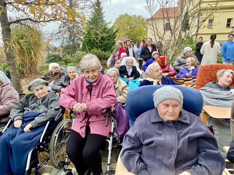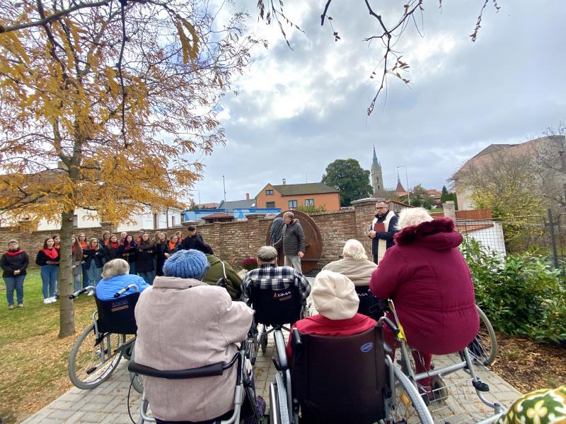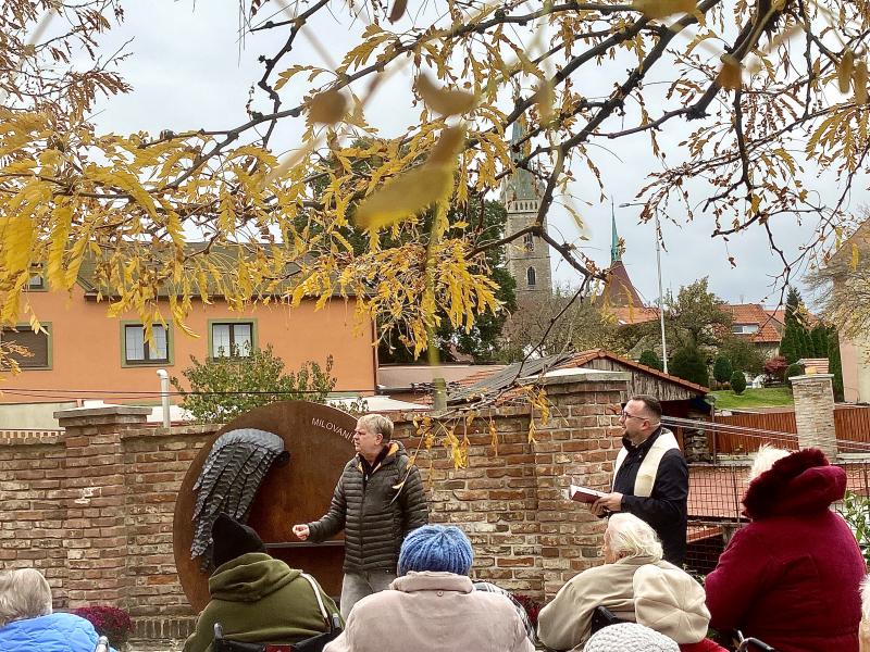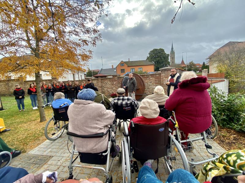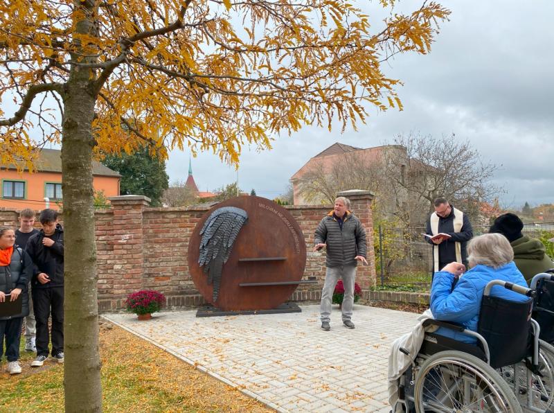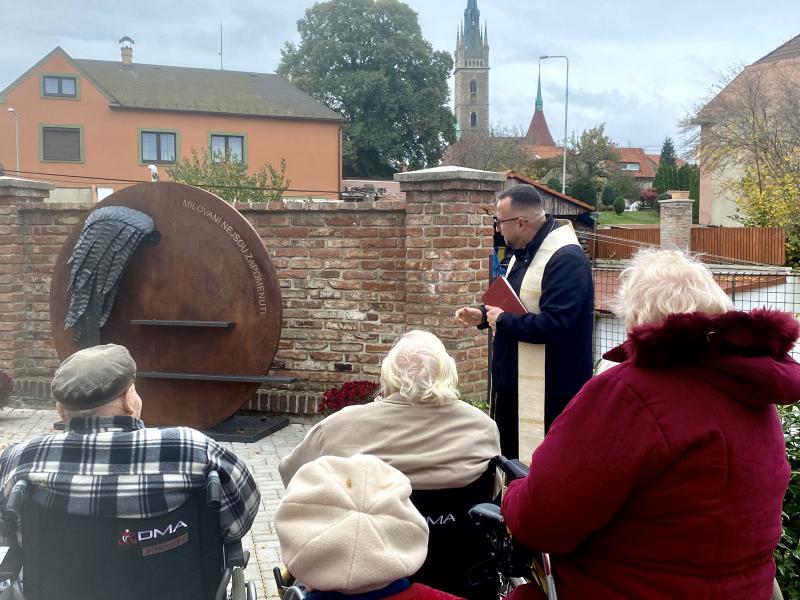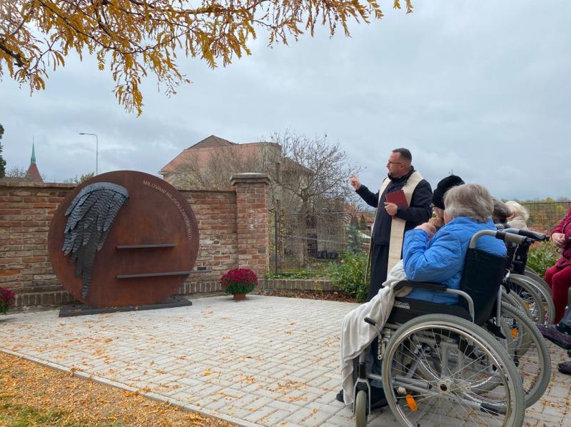 V našem Domově se dnes konala slavnostní událost, vysvěcení pietního místa. Při této příležitosti, jsme se všichni, klienti, personál i hosté, sešli venku za budovou Domova, kde celá akce probíhala. Pietní místo poskytuje našim klientům možnost v klidu si posedět, zapálit svíčku a zavzpomínat si na své blízké, kteří tu s nimi již nemohou být. Dominantou pietního místa je kruhová struktura s andělským křídlem umístěná na zámkové dlažbě a obohacená o dvě poličky, z nichž každá nese svůj význam. Celé místo je situováno do rohu zahrady v blízkosti nedalekého jezírka, kde mají klienti dostatek klidu a soukromí.