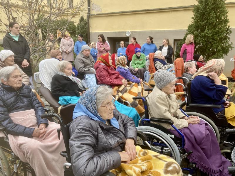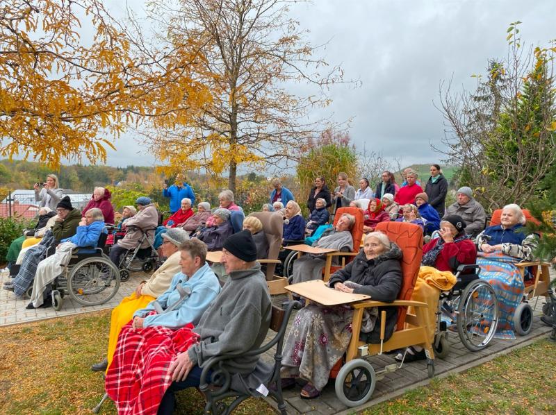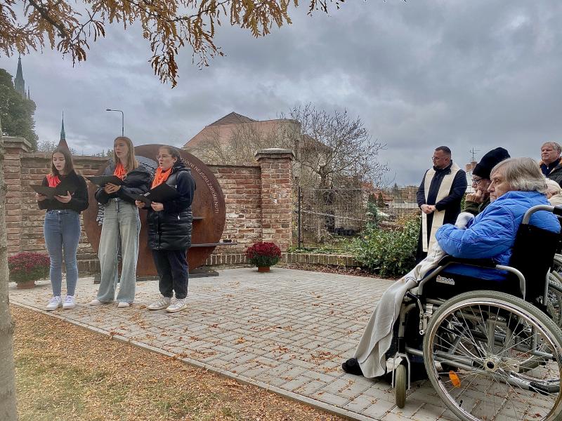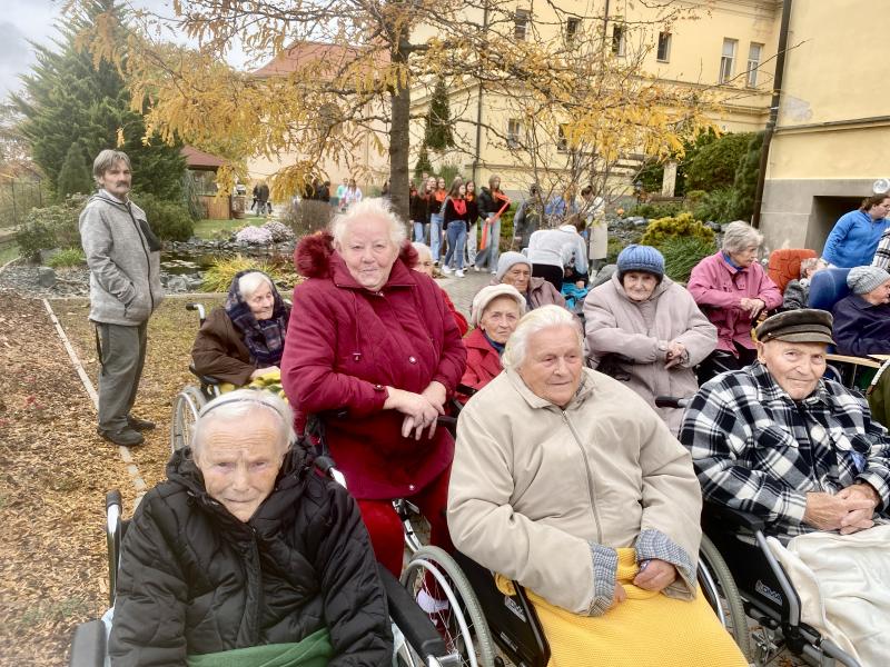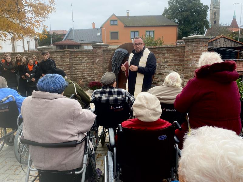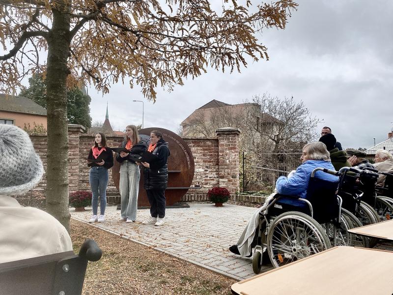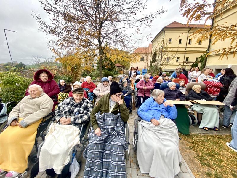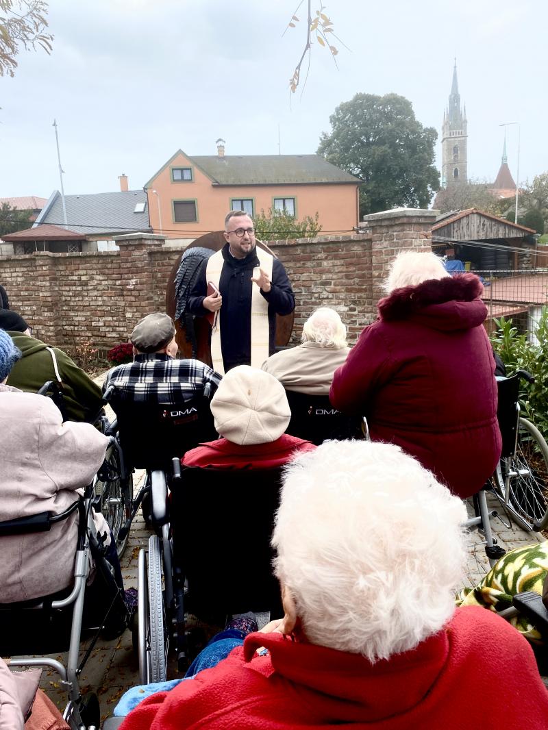 V našem Domově se dnes konala slavnostní událost, vysvěcení pietního místa. Při této příležitosti, jsme se všichni, klienti, personál i hosté, sešli venku za budovou Domova, kde celá akce probíhala. Pietní místo poskytuje našim klientům možnost v klidu si posedět, zapálit svíčku a zavzpomínat si na své blízké, kteří tu s nimi již nemohou být. Dominantou pietního místa je kruhová struktura s andělským křídlem umístěná na zámkové dlažbě a obohacená o dvě poličky, z nichž každá nese svůj význam. Celé místo je situováno do rohu zahrady v blízkosti nedalekého jezírka, kde mají klienti dostatek klidu a soukromí.