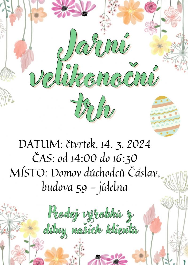 Domov důchodců Čáslav srdečně zve na jarní velikonoční trh, který se uskuteční ve čtvrtek, 14. 3. 2024 na jídelně velké budovy, v čase od 14:00 do 16:30. Na místě budou k zakoupení výrobky z dílny našich klientů.