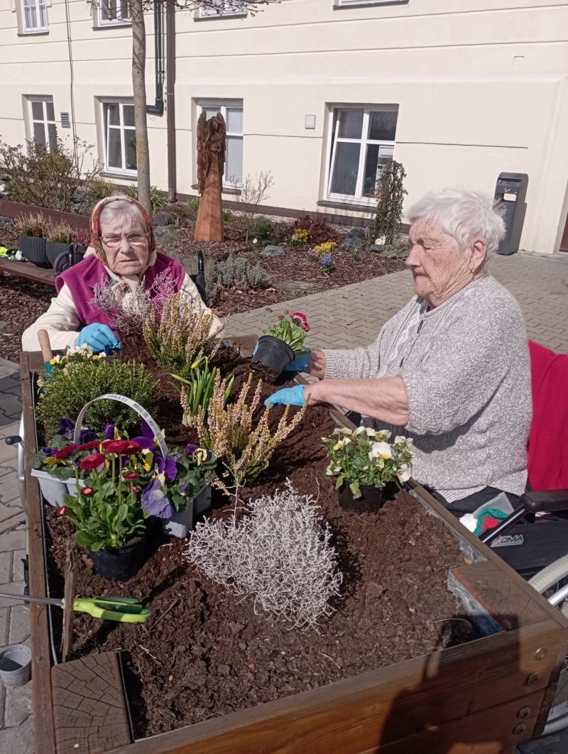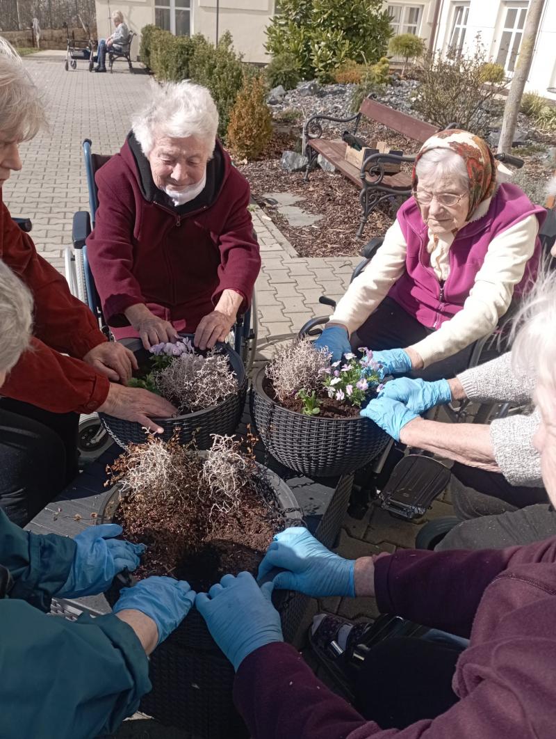 Naše zahrada září jarními barvami. V minulém týdnu naše šikovné uživatelky spojily své síly a společně osázely mobilní zahrádky, truhlíky a květináče. Uživatelky prostřednictvím této venkovní aktivity mohly zavzpomínat na své zahrádky a zároveň procvičily jemnou motoriku. Nahlédněte, jak naše zahrada krásně kvete. Jak se Vám líbí?