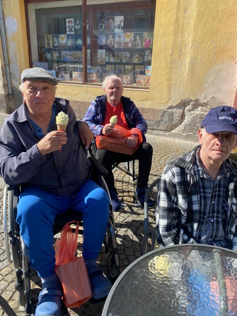 Ani pánové nezůstávají pozadu. Podílejí se na tvoření a výsledné výrobky poté zdobí náš Domov. Také se těší z vycházek do města, obzvlášť když si mohou dát něco dobrého na zub.