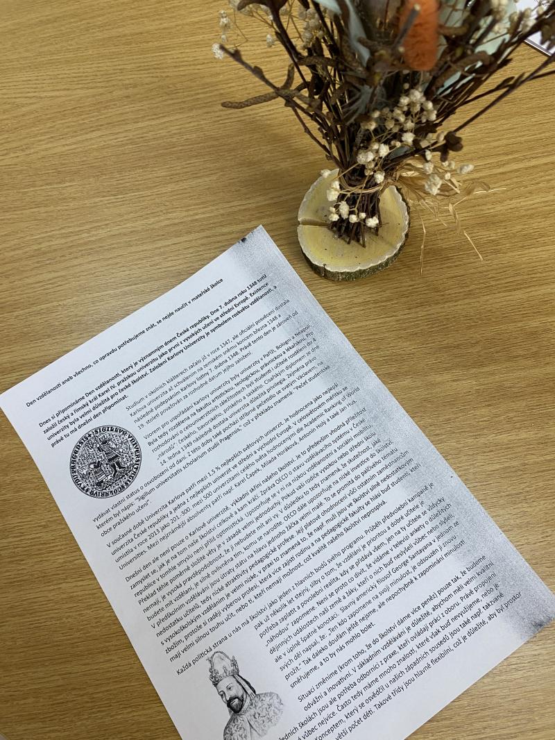 Dnešním dnem (7.4.) si Česká republika připomíná významnou událost, a sice založení Karlovy univerzity. Tuto událost jsme si i my v Domově připomněli a dozvěděli něco málo o historii naší vzácné univerzity. Abychom vzdělání našich uživatelů nenechali ležet ladem, vrátili jsme je zpět do školních lavic. Procvičovaly si český jazyk a počty.