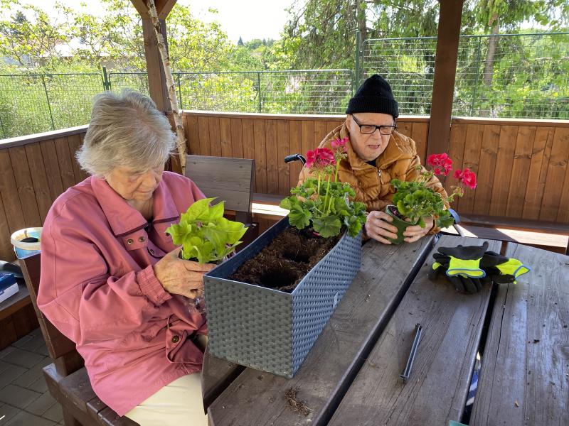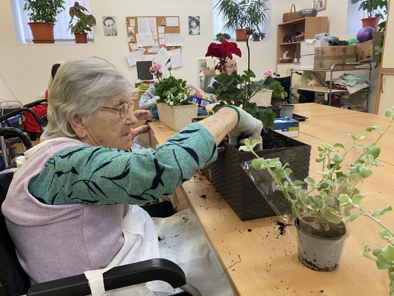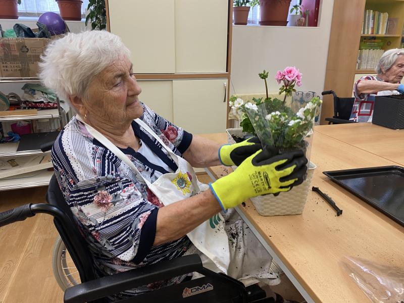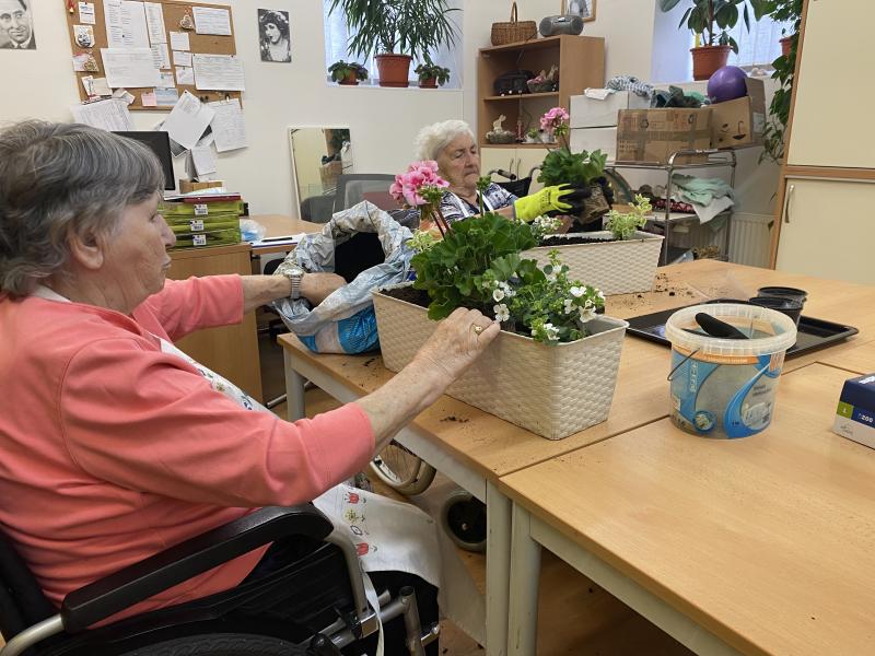 Květnové počasí není příliš lichotivé. Dlouho jsme s osazováním truhlíků čekali na lepší počasí, ale už jsme to nevydrželi. Jedno odpoledne jsme se do toho pustili a postupně osázeli truhlíky muškáty, které budou přes léto zdobit naše okna. Potrénovali jsme tímto způsobem jemnou motoriku a zavzpomínali na časy, kdy naši uživatelé trávili čas na zahrádkách.