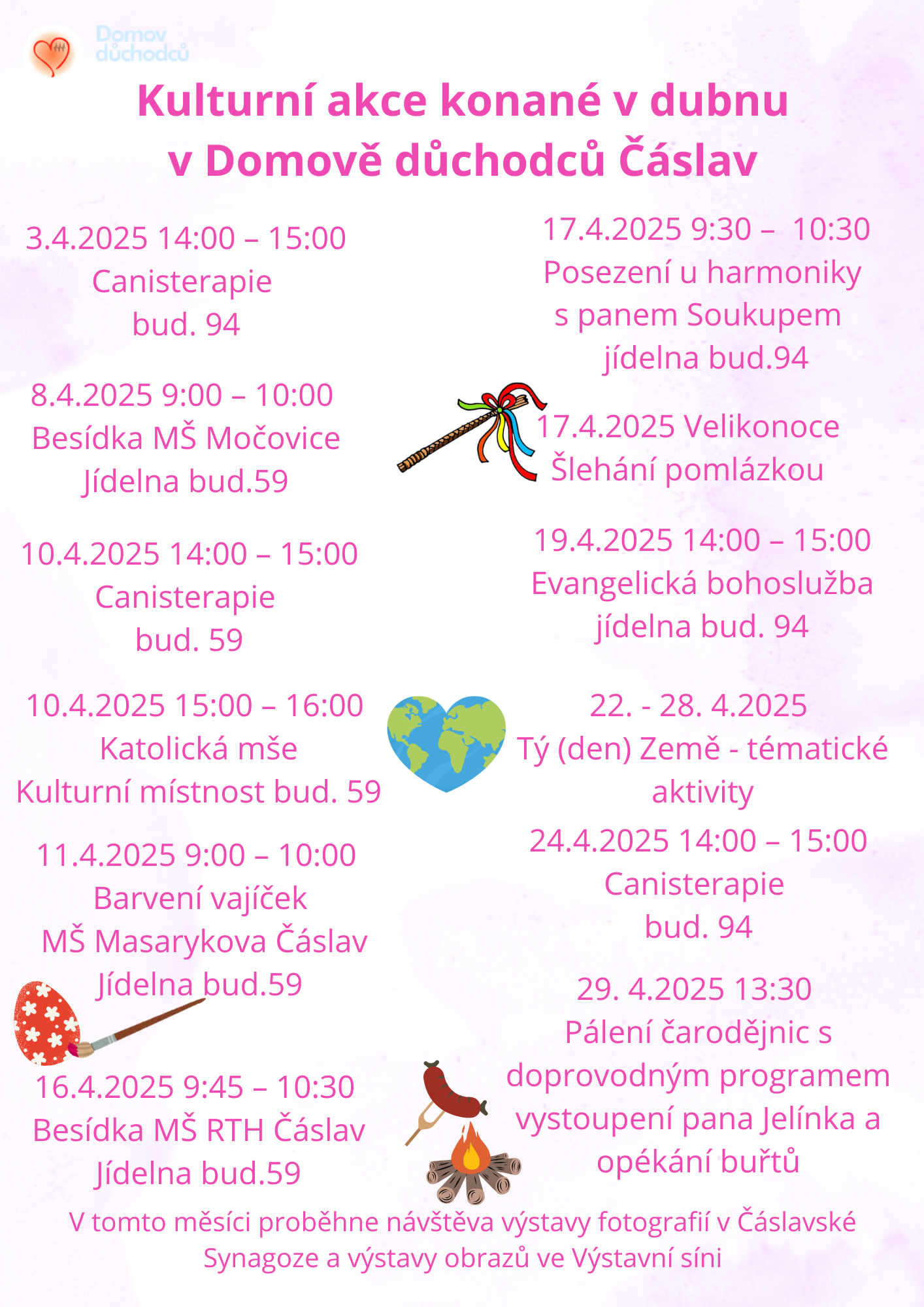 Nahlédněte, jaké kulturní akce se našem v Domově budou konat v dubnu. Touto cestou bychom rádi oslovili rodinné příslušníky našich uživatelů. Zveme vás na akce, na kterých můžete strávit čas společně se svými blízkými. Tyto plakáty s akcemi také najdete u hlavních vchodů našich budov. Rovněž jsou vyvěšené po budovách.