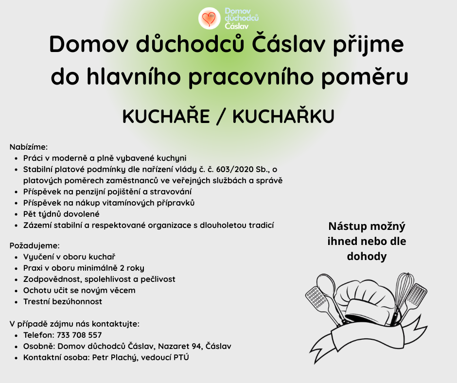 Domov důchodců Čáslav přijme do hlavního pracovního poměru KUCHAŘE / KUCHAŘKU.