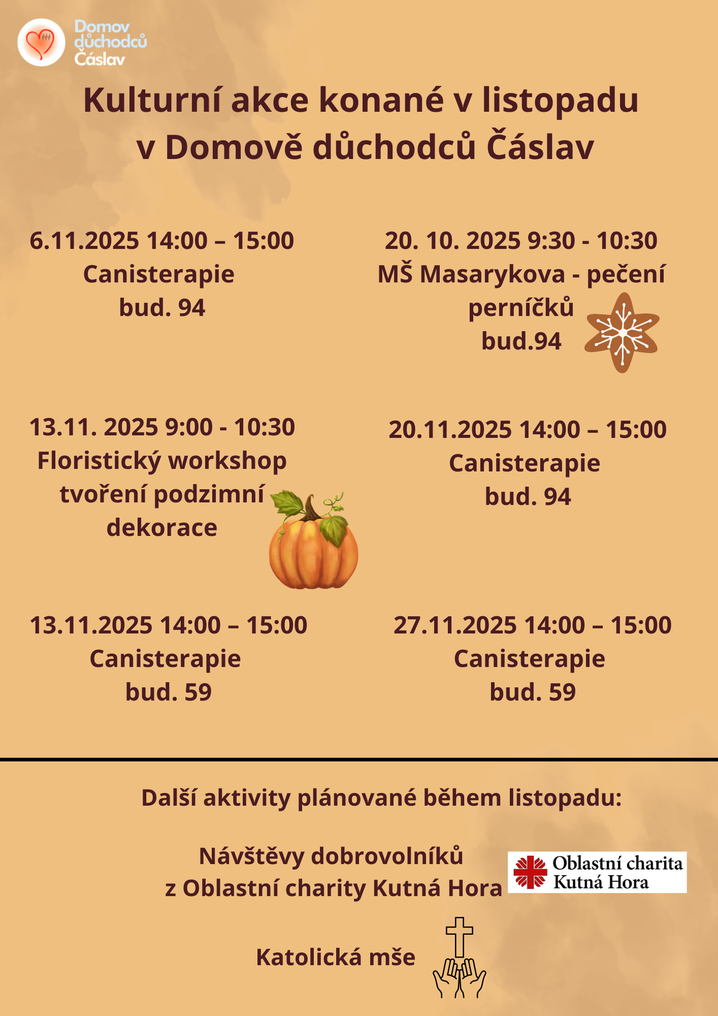Nahlédněte, jaké kulturní akce se našem v Domově budou konat v listopadu. Touto cestou bychom rádi oslovili rodinné příslušníky našich uživatelů.